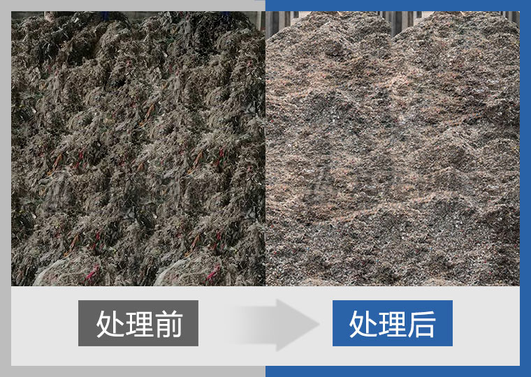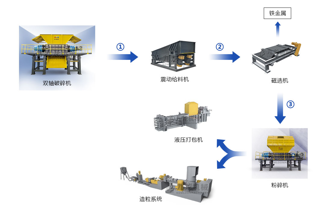 抓机将堆放的绞绳送到链板式输送机上,通过链板输送,物料均匀地落到双轴撕碎机上,将缠绕在一起的柔性物料破碎打散。随后,破碎后的物料通过除铁器将金属与其他物质分开。除铁后的物料可以进入细碎机细碎处理,满足后续生产加工要求。