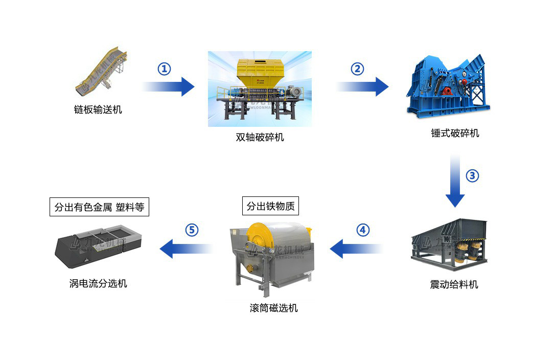 链板输送机将废旧小家电输送至撕碎机内进行撕裂、剪切破碎,将小家电破碎成较小粒度,通过震动给料机将铁、有色金属和非金属震散——提高后续工艺效率。物料经过磁选机分离出铁金属,其余物料通过涡电流分选机分选出有色金属和非金属,有色金属再经过气流分选机分离出铜和铝,并由各自输送机送出。