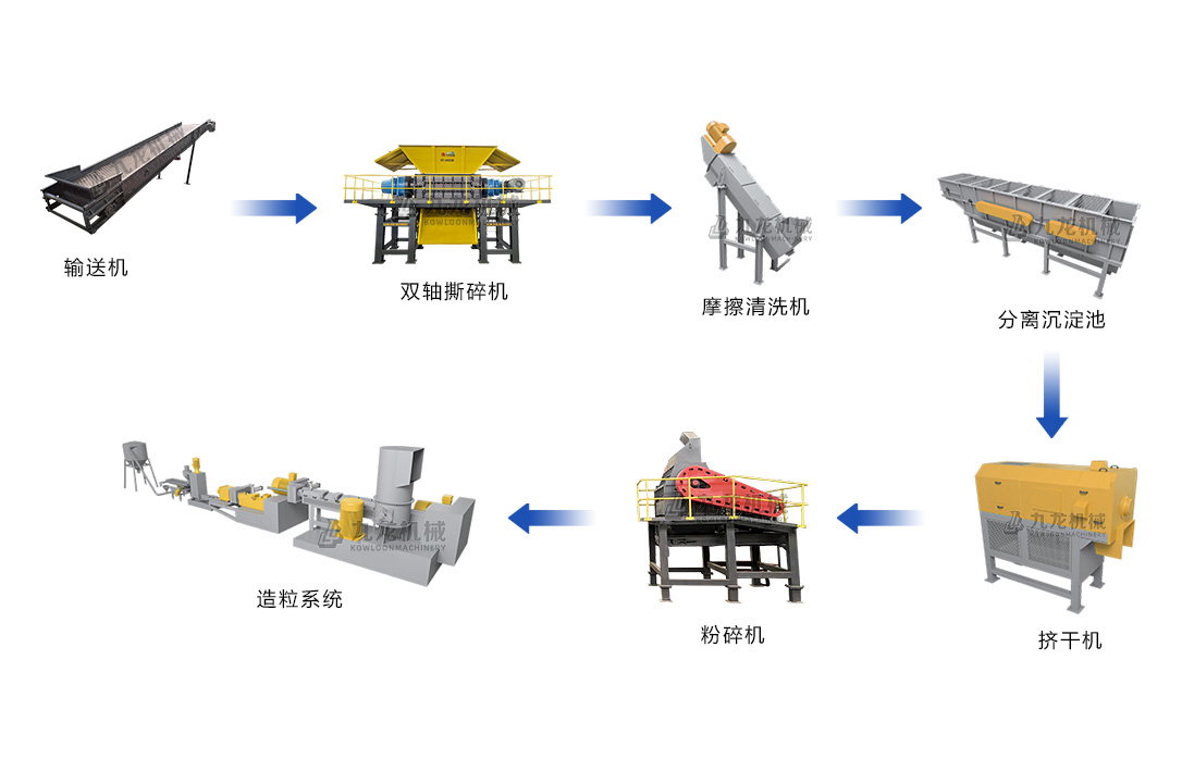 上料输送机将吨包袋均匀输送至撕碎机内进行撕裂、剪切破碎,将吨包袋破碎成较小粒度,再通过清洗、干燥后可用于销售、造粒、注塑和吹膜等,产线的最终产品为塑料粒子,质量好,产量高。整条生产线从废料到成品,具有操作简易、效率高、节能环保等特点。可根据用户需求定制产量在300-2000kg/h的最优方案。