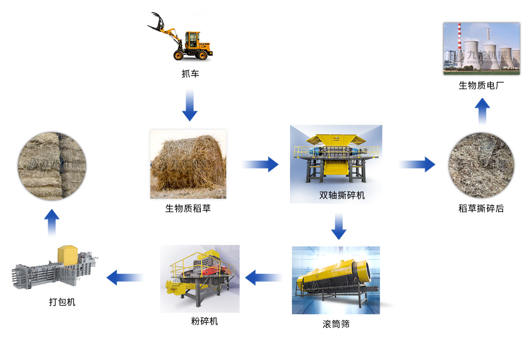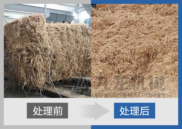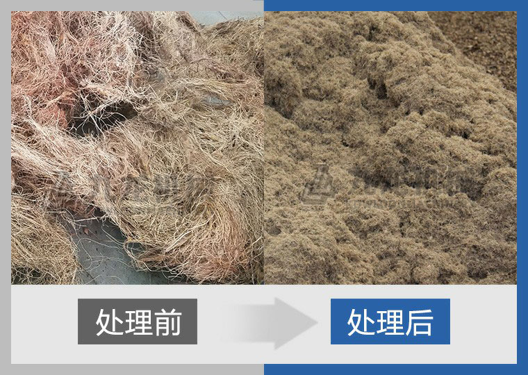 棕榈丝被链板式输送机送入双轴撕碎机,并由上方的液压压料器推入刀箱内进行破碎处理。输送机可根据主电机负荷自动调节进料速度,保证原料依次连续足量供应。破碎后的物料集中汇集到一条出料输送机上输出,等待下一步的工艺处置。
